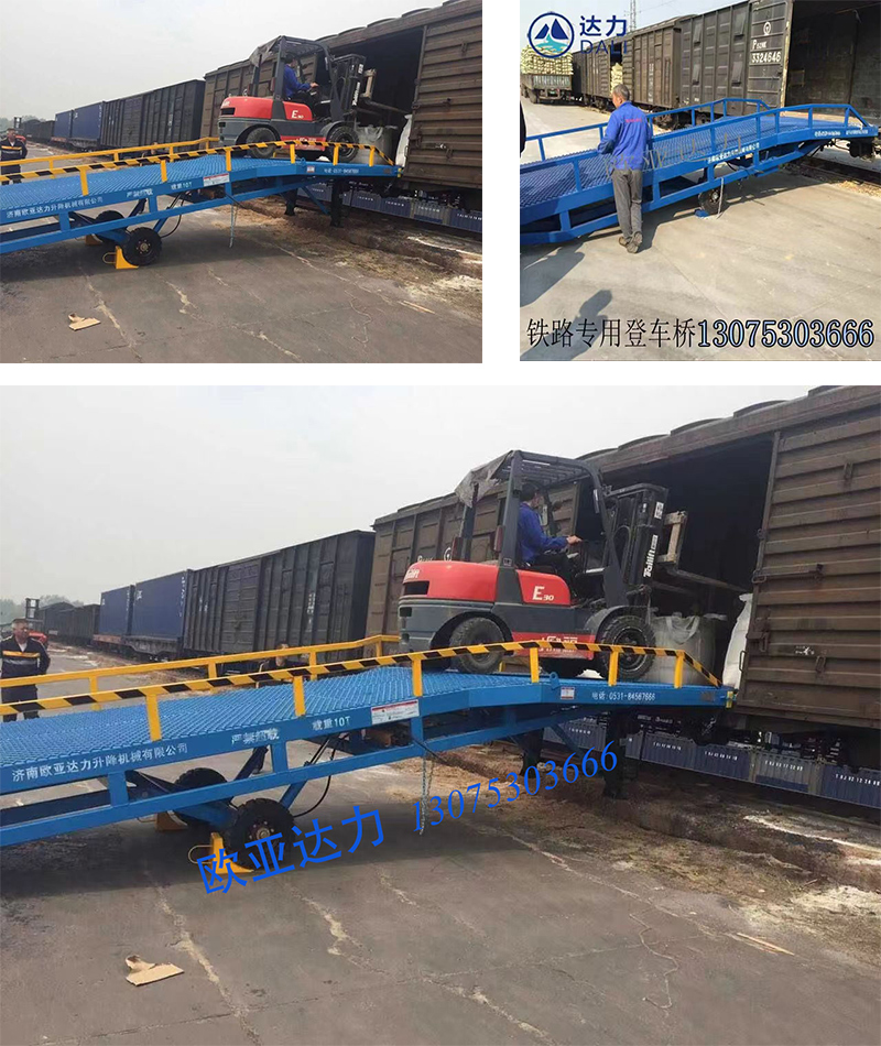 火車站專用登車橋是實現(xiàn)在沒有高站臺的貨場,叉車通過登車橋快速進入棚車的輔助設施,它的高度調節(jié)功能使叉車與棚車之間架起一一座橋梁, 為了滿足叉車能在登車橋到棚車之間能夠拐彎的要求,火車專用登車橋在前端平臺部分,原有寬度的基礎上加寬到2.7米,